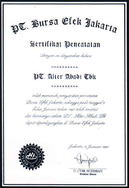 Pada tahun 1994 dan 1996 PT Alter Abadi Tbk mendapatkan penghargaan Sahwali kelas dunia atas prestasinya dalam pengelolaan lingkungan. Pada tahun 1997 PT. Alter Abadi Tbk menjadi perusahaan yang terdaftar di Bursa Efek Indonesia.